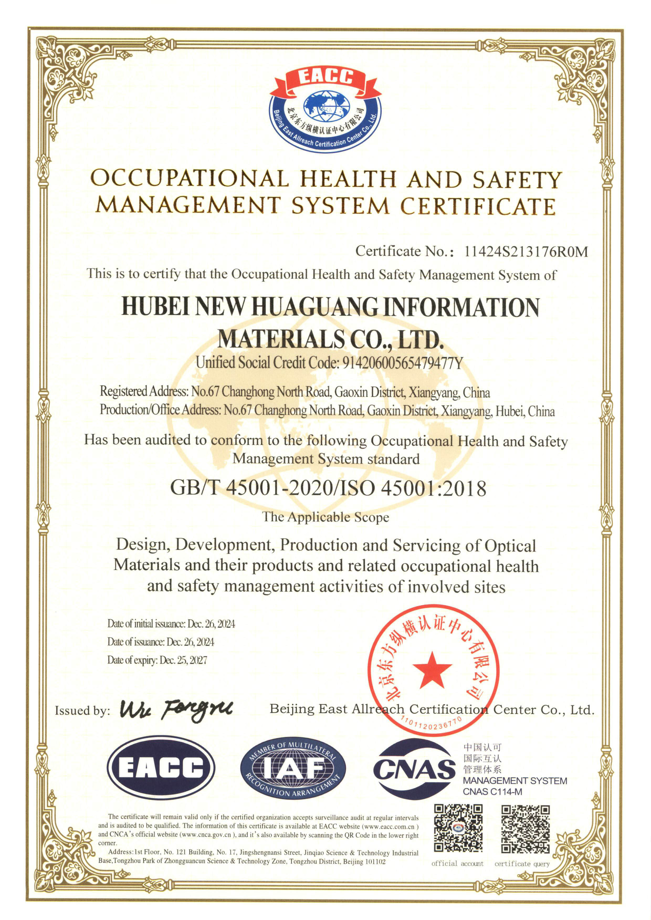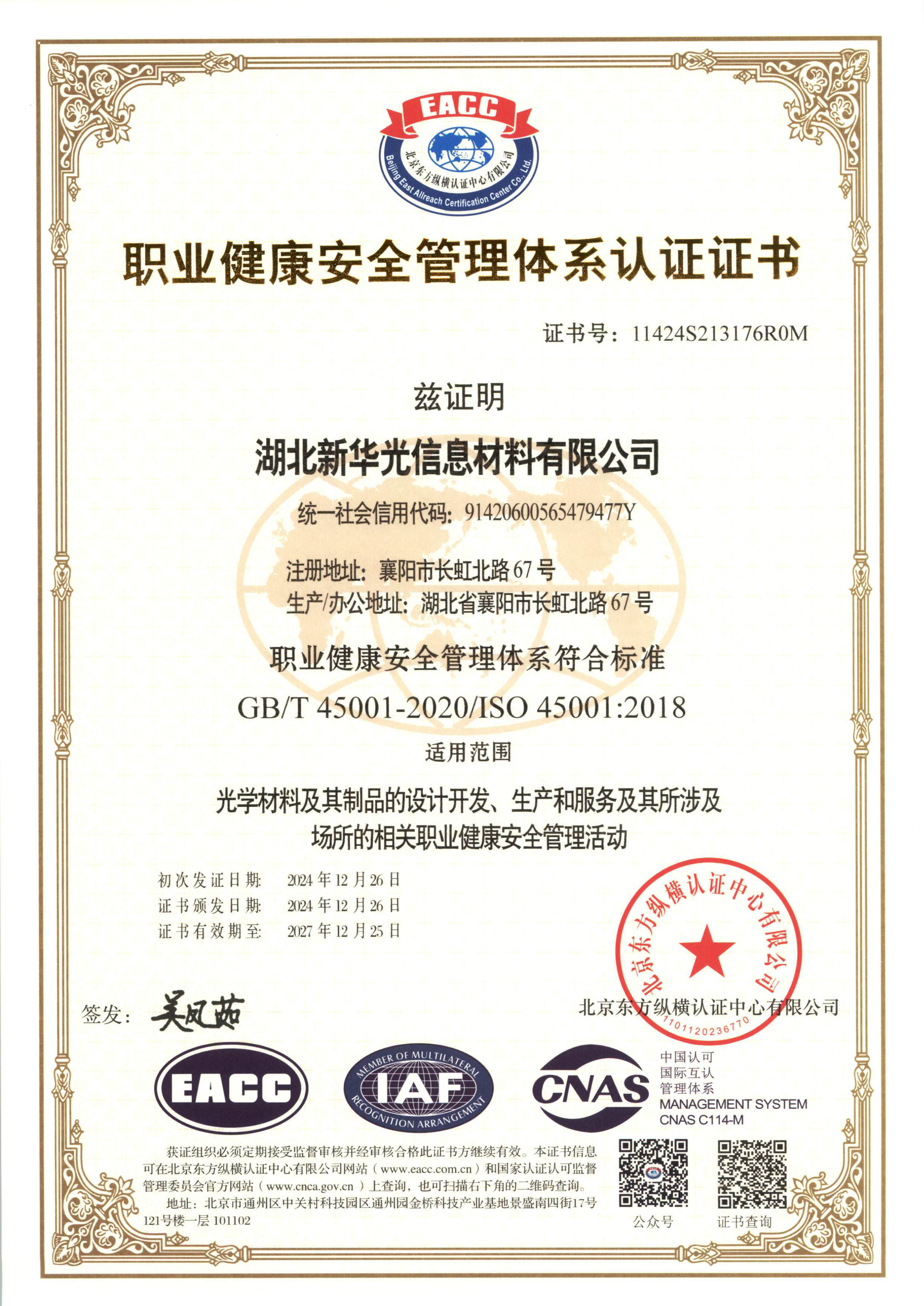 2024年通過GB/T 45001-2020(idt ISO 45001:2018)職業(yè)健康安全管理體系標(biāo)準(zhǔn)再認(rèn)證。